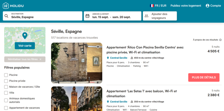 Holidu s’adresse tout d’abord aux voyageurs car la plateforme est principalement connue comme portail de réservation qui regroupe des annonces de locations de vacances. Elle aide à comparer les prix et réserver.